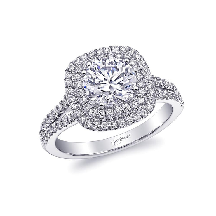 This gorgeous double halo engagement ring makes a sparkling statement. A split shank of diamonds hugs the finger on either side. Shown with a 1.25 ct center stone. Center stone not included.