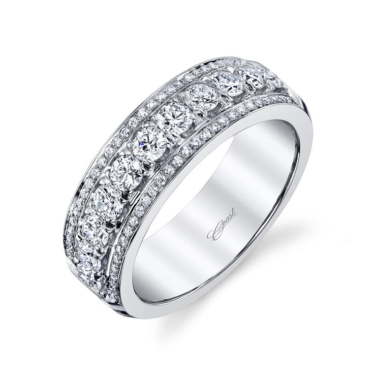 This beautiful band is one-of-a-kind with its fishtail set diamonds down the center and framed with pave set diamonds on the outer rows.
