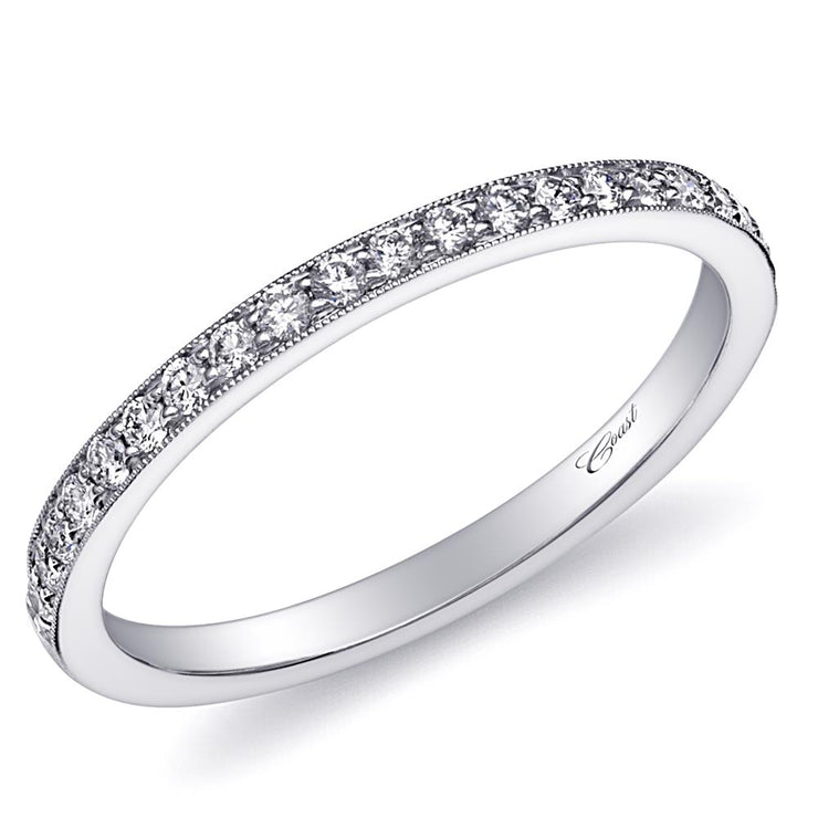 This elegant wedding band features fine pave set diamonds across the top half of the ring. Finished with delicate milgrain edging.