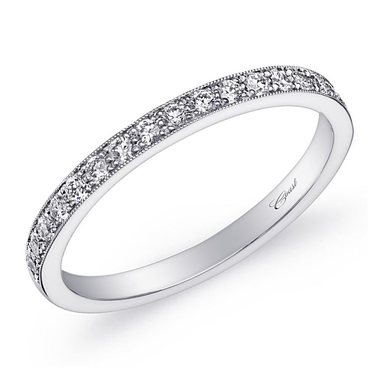 This elegant wedding band features fine pave set diamonds across the top half of the ring. Finished with delicate milgrain edging.